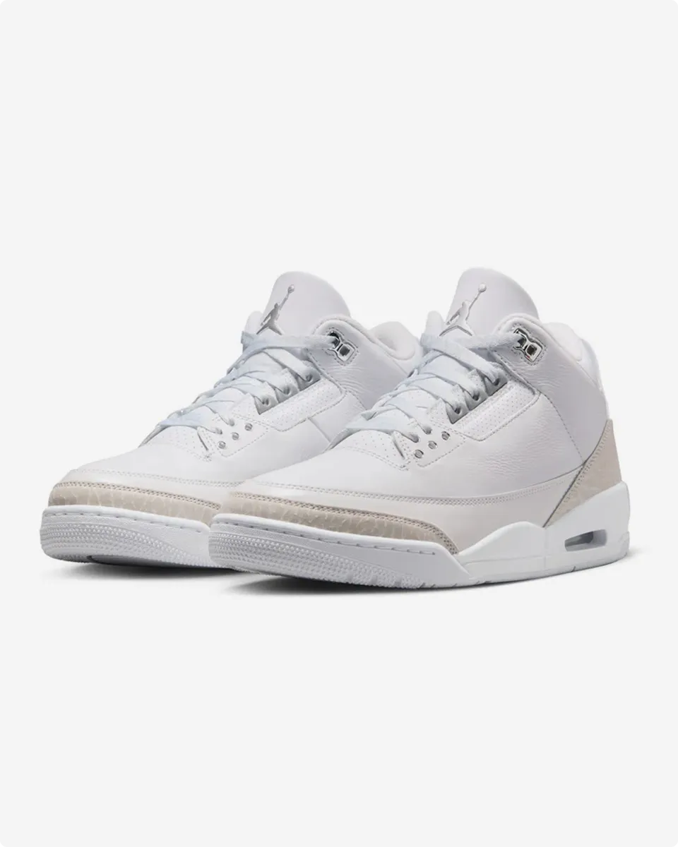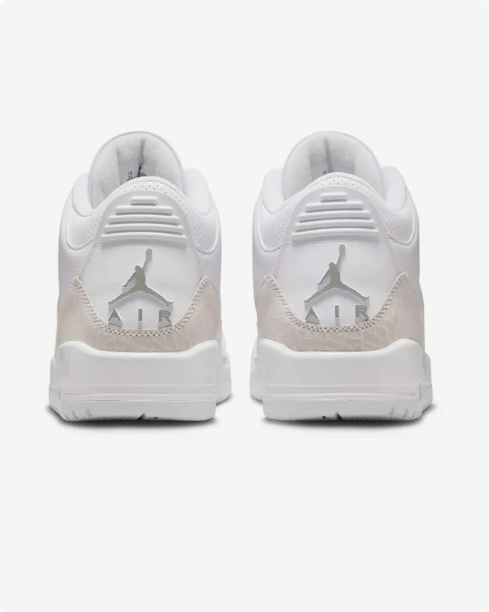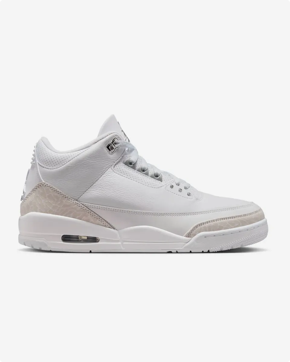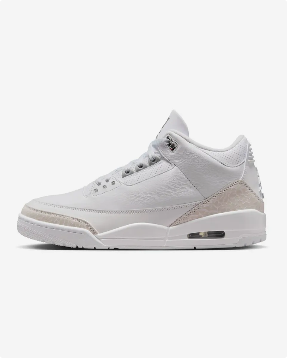 The 2025 version stays true to its roots with premium white tumbled leather and metallic silver details on the eyelets, Jumpman, and heel tab. Signature elephant print on the toe and heel completes the classic look, appealing to both OG fans and new enthusiasts.