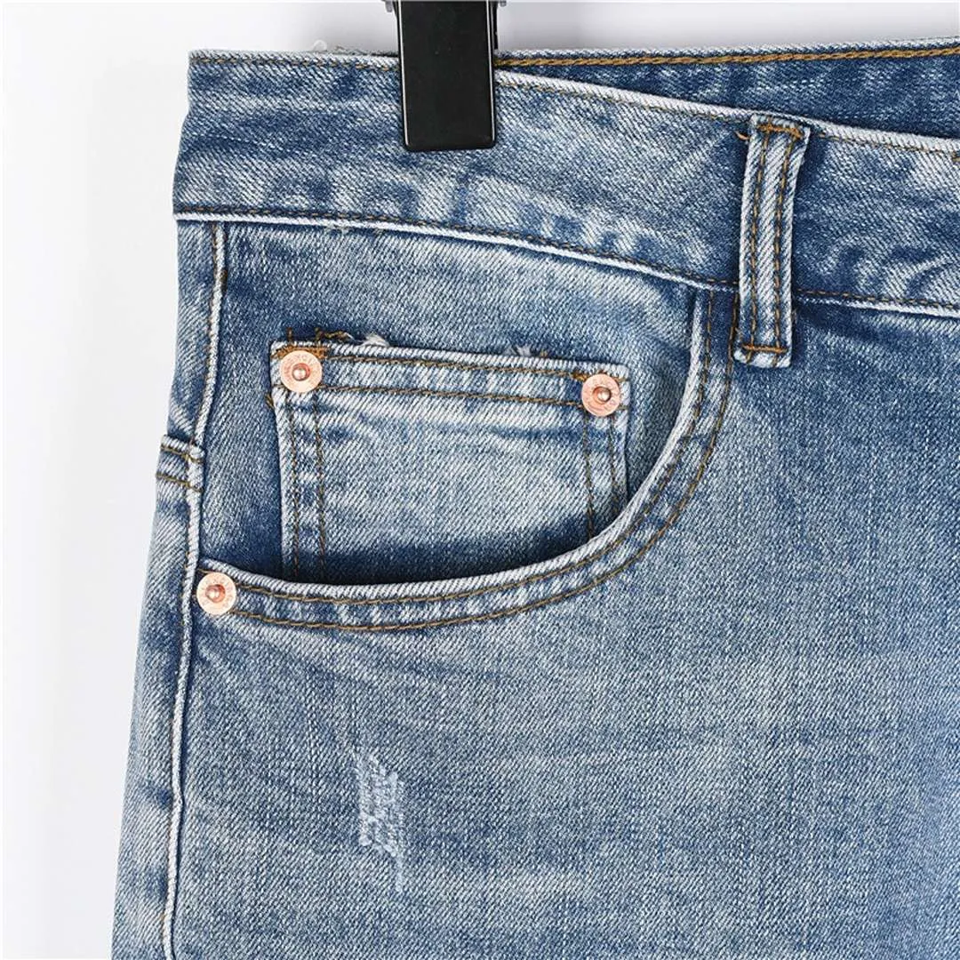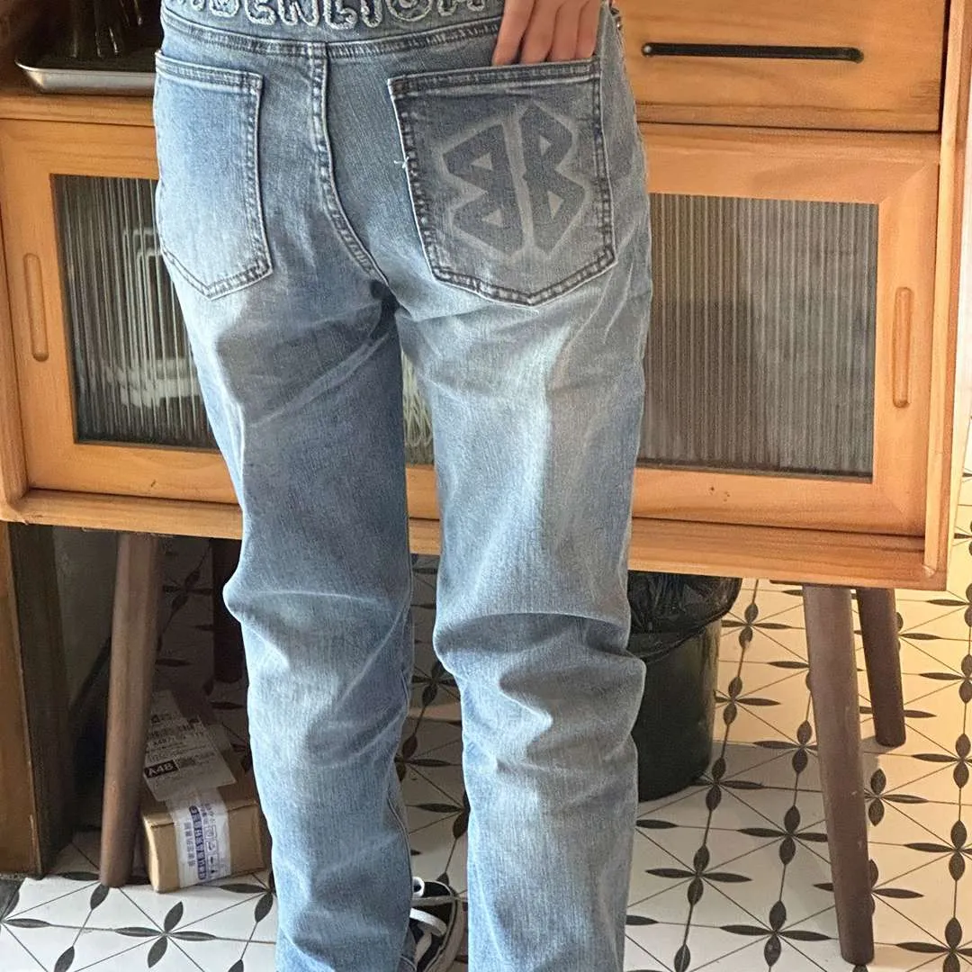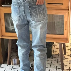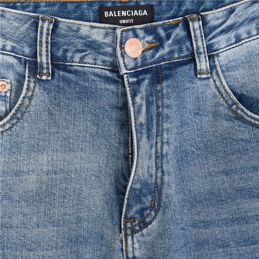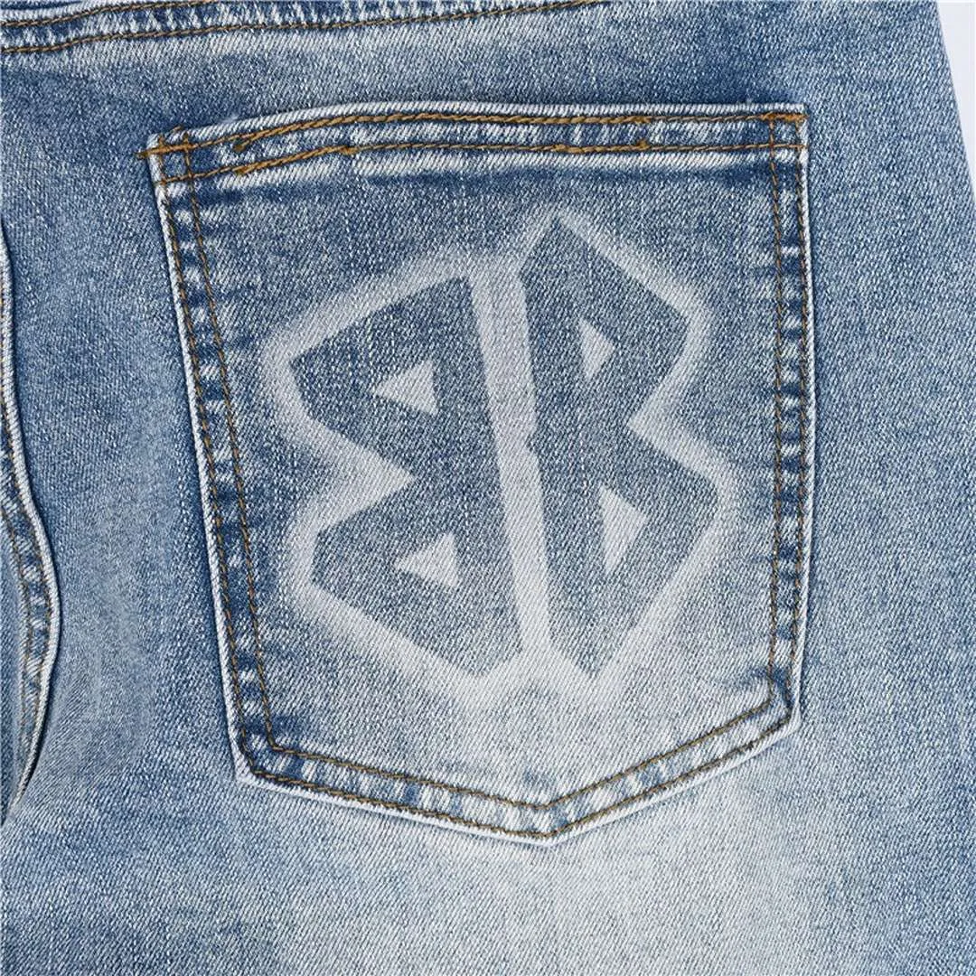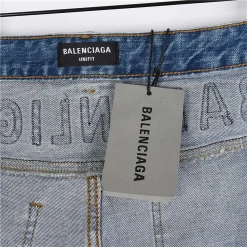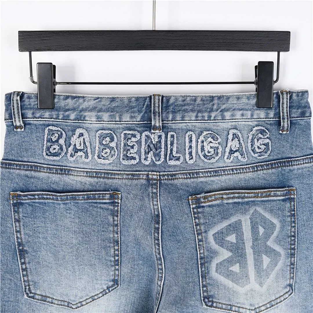 Step into standout streetwear with these light wash jeans from BLCG. The back waistband features oversized “BALENCIAGA” embroidery, while the rear pocket is stamped with the iconic BB logo in matching denim tones. Designed with light fading, subtle distressing, and a straight-leg silhouette, they offer a balanced mix of bold branding and vintage-inspired texture. A go-to pair for everyday edge with high-fashion flair.