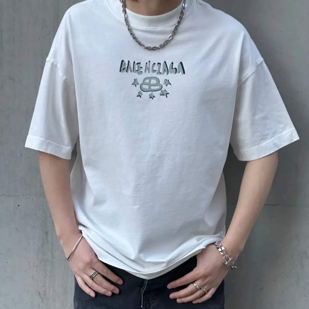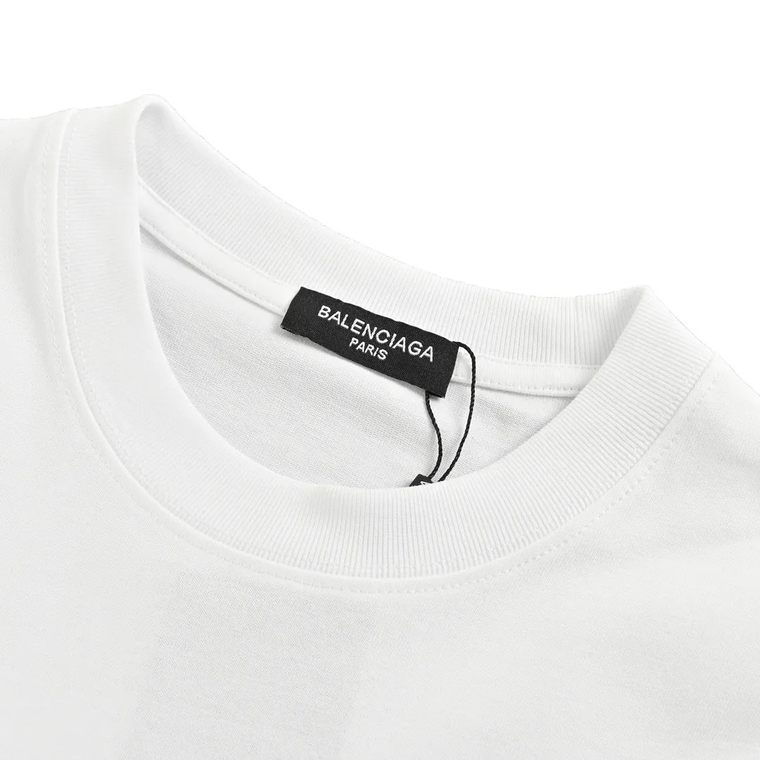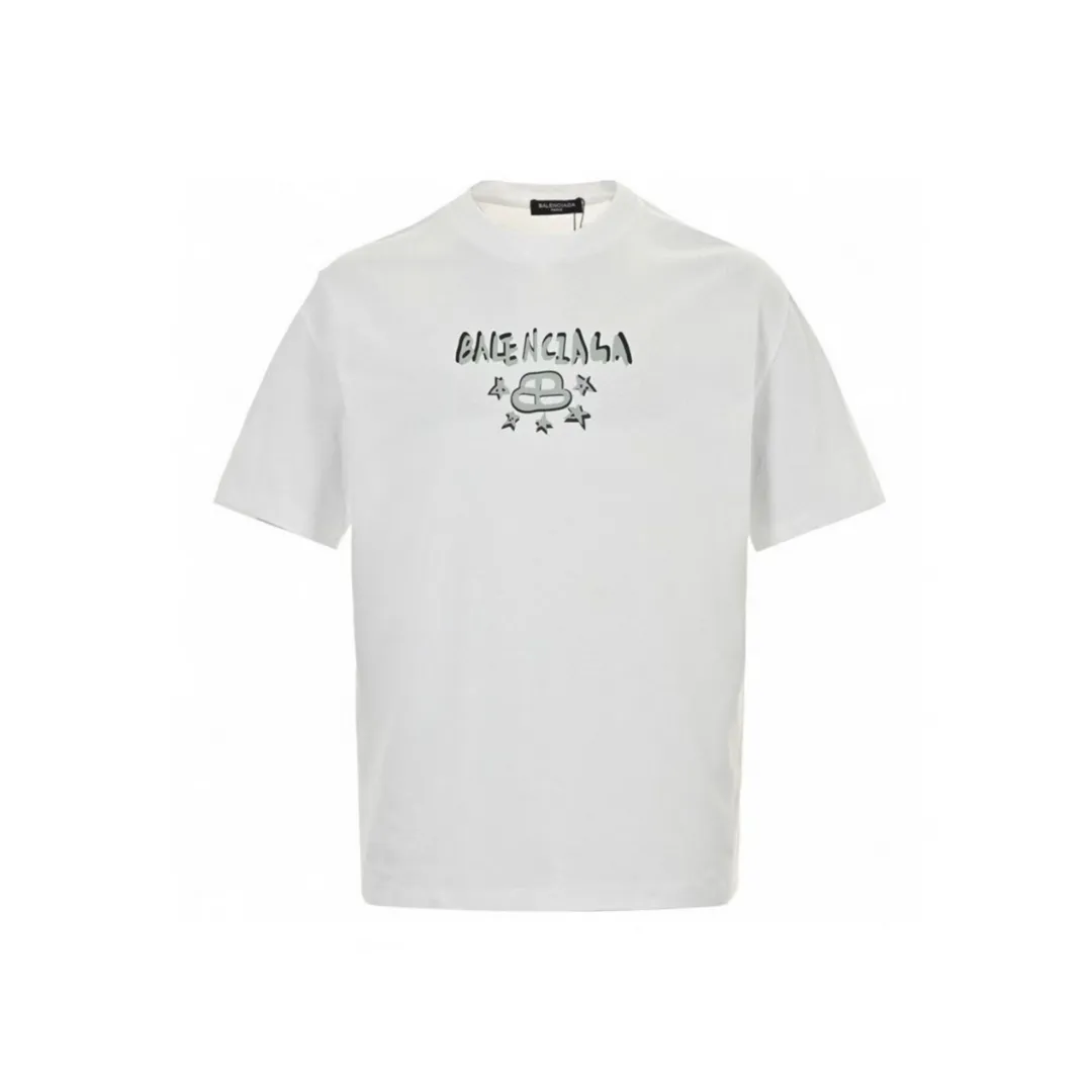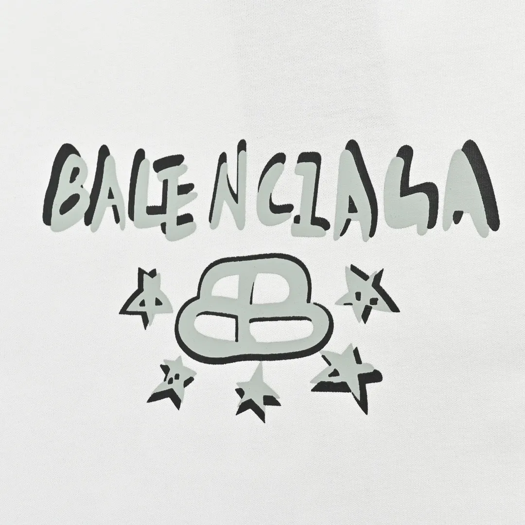 A fresh graphic update from BLCG, this white T-shirt features a bold butterfly design on the back paired with a graffiti-style Balenciaga logo across the chest. Artistic drips and star accents surround the signature BB emblem, adding a youthful and edgy streetwear vibe. Cut in a relaxed fit with soft cotton fabric, it’s made for those who appreciate expressive design and standout silhouettes.