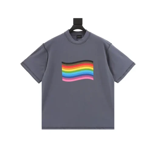 This unisex washed grey T-shirt showcases a bold wavy rainbow graphic at the chest, blending vivid color with a minimalist silhouette. Crafted from soft cotton and designed with a relaxed fit, crew neck, and short sleeves, it offers comfort and versatility for everyday wear. The neutral grey base balances vibrant tones with understated cool.