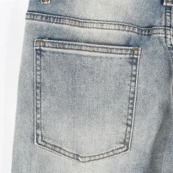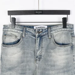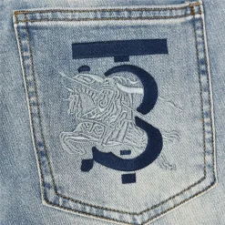 These Burberry jeans bring a refined touch to classic denim with a soft light blue wash and subtle faded textures throughout. The highlight lies in the rear pocket, featuring a dark embroidered crest and stylized “B” monogram for a distinctive signature finish. With a straight-leg cut and mid-rise waist, this pair is crafted for both everyday comfort and understated elegance. A versatile wardrobe essential that balances premium detail with casual appeal.