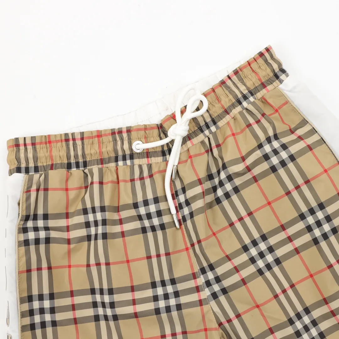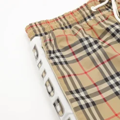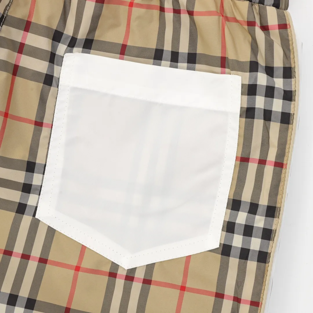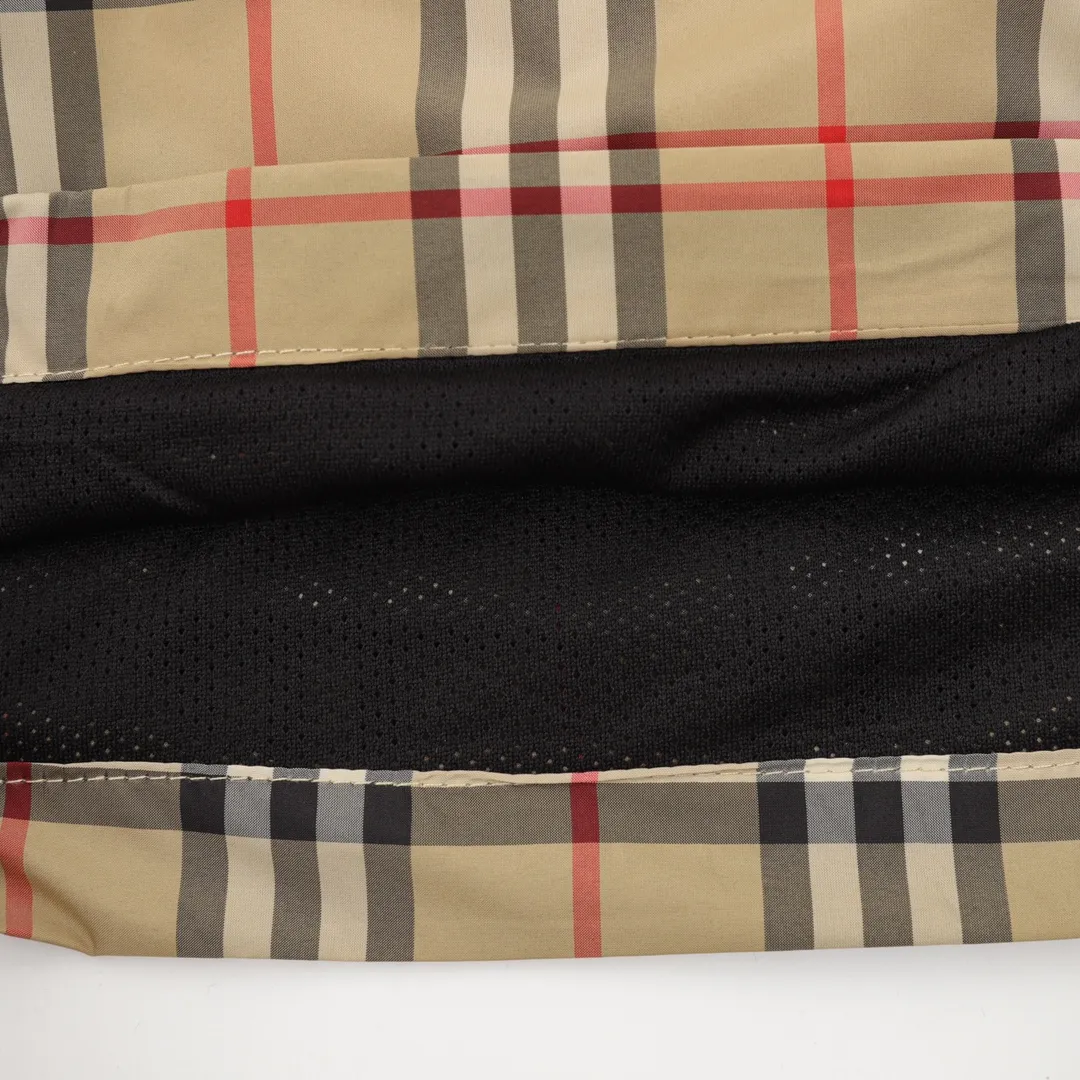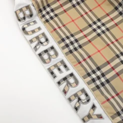 Classic meets sporty with these Burberry shorts, crafted in the brand’s iconic vintage check pattern. Side panels in contrasting white are detailed with bold “Burberry” lettering for a modern twist. Featuring an elastic waistband with drawstring and a utility-inspired rear patch pocket, these shorts combine comfort with street-ready appeal ideal for laid-back summer days or elevated casual looks.