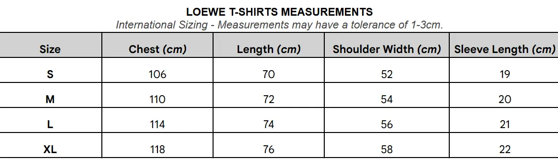 Description: The Loewe T-Shirt is a refined fusion of Spanish craftsmanship heritage and contemporary artistry, representing minimalist luxury style. The product is crafted from premium cotton material, featuring a comfortable and impeccably tailored fit. The Loewe T-Shirt is a sophisticated style statement, identifiable by high-artistic logos or prints, asserting a unique, luxurious aesthetic and finesse in fashion.