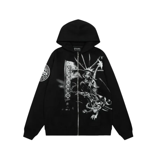 Description: The Travis Scott Graphic Print Full Zip Hoodie is an exclusive Cactus Jack merchandise piece, offering greater versatility with its full-length zip-up design. This hoodie maintains the signature oversized fit, is constructed from heavy-duty fleece, and includes a practical hood and side pockets. The distinct feature is the bold, expansive graphic prints (often covering the entire garment, including the hood and sleeves), establishing an ultimate streetwear statement with powerful artistic exclusivity.